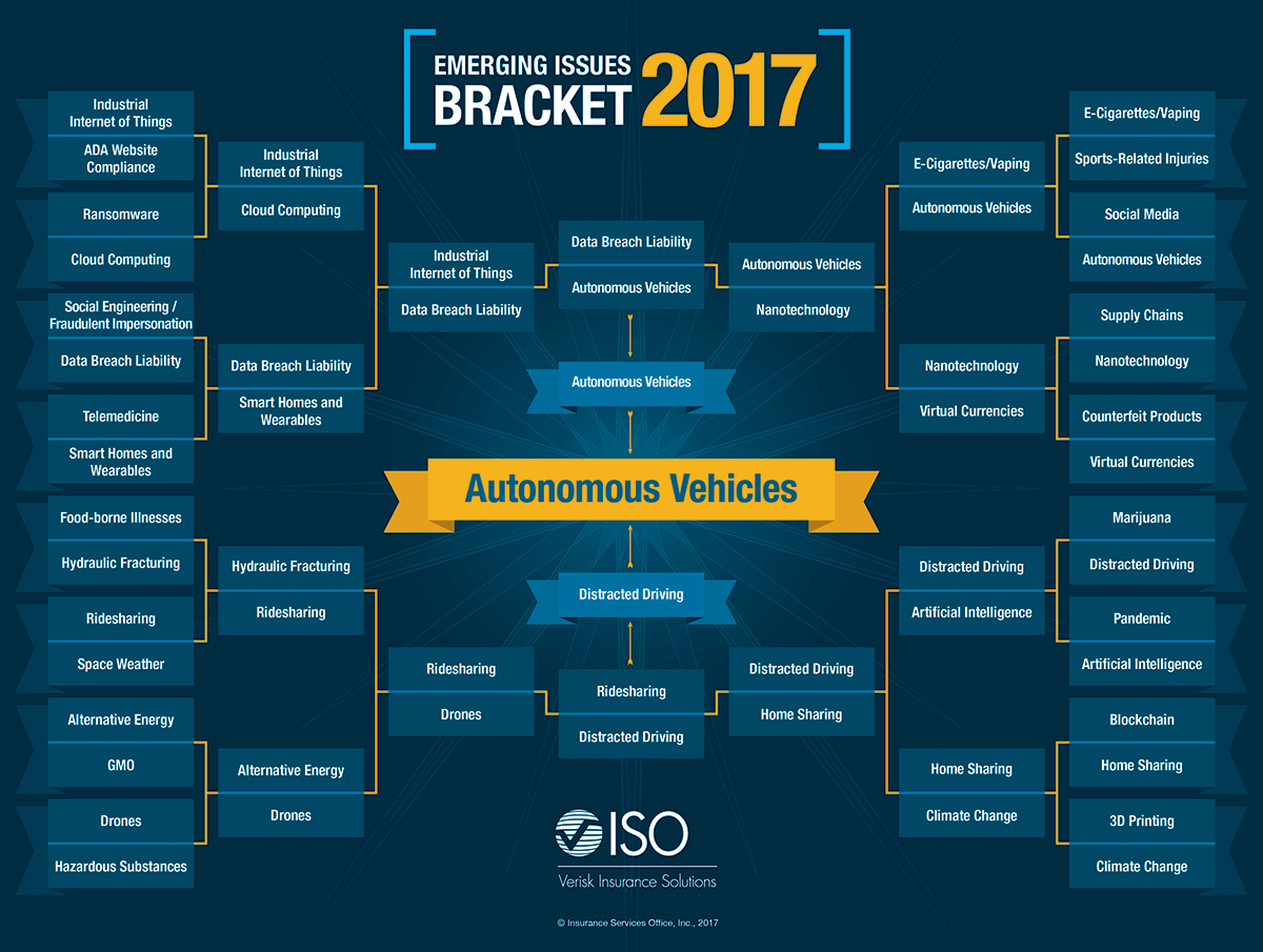 Every March, the ISO Emerging Issues Bracket pits 32 emerging trends and risks against one another, tournament-style. Insurance professionals from various parts of the industry are surveyed and asked to choose their favorites in each matchup, with the issues of most concern advancing to each subsequent round. The issues are seeded based on web traffic to the Emerging Issues Portal (ISOnet® login required), past Bracket performance, and ISO customer feedback.