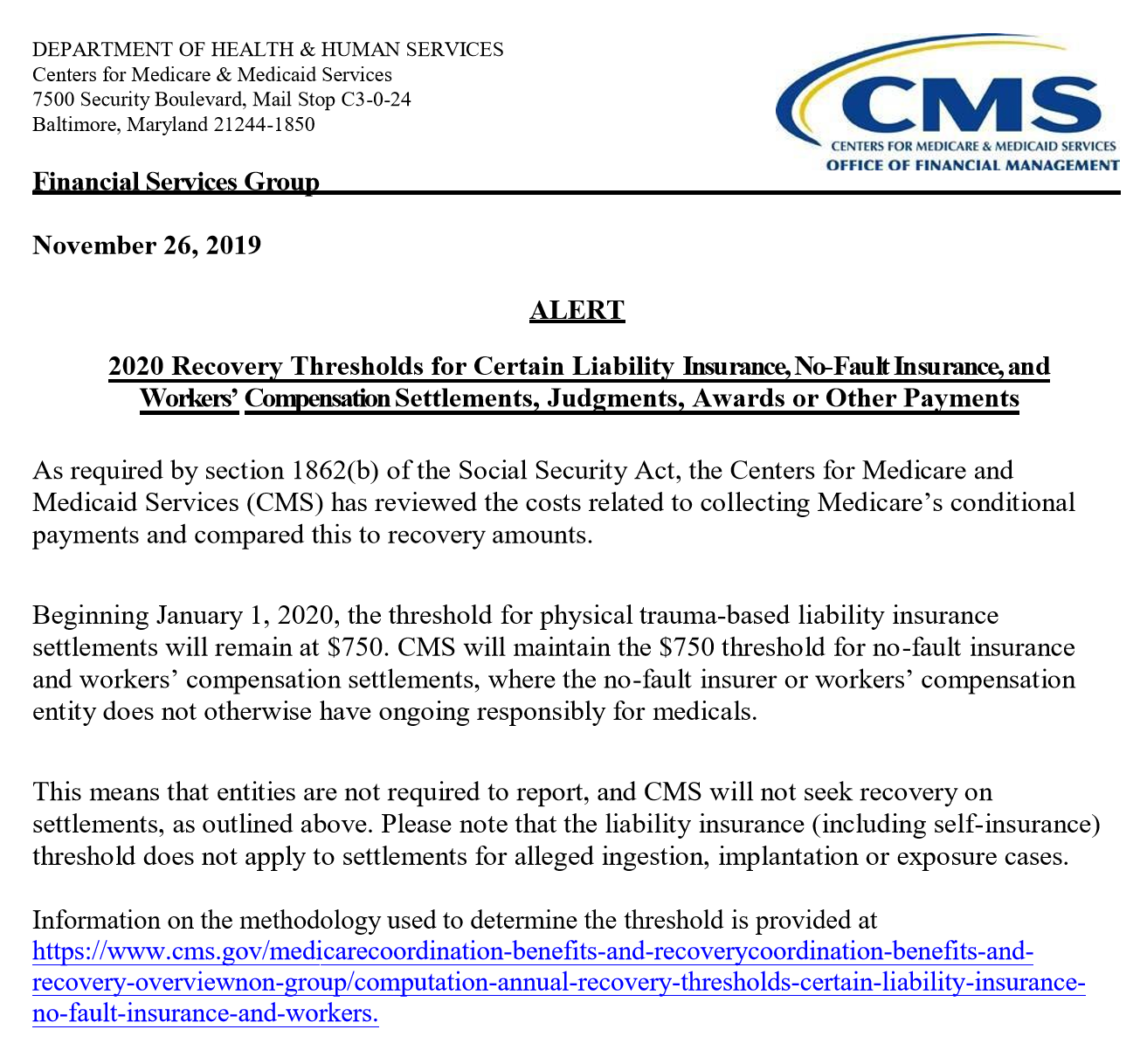 Beginning January 1, 2020, the threshold for physical trauma-based liability insurance settlements will remain at $750. CMS will maintain the $750 threshold for no-fault insurance and workers’ compensation settlements, where the no-fault insurer or workers’ compensation entity does not otherwise have ongoing responsibly for medicals. This means that entities are not required to report, and CMS will not seek recovery on settlements, as outlined above. Please note that the liability insurance (including self-insurance) threshold does not apply to settlements for alleged ingestion, implantation or exposure cases.