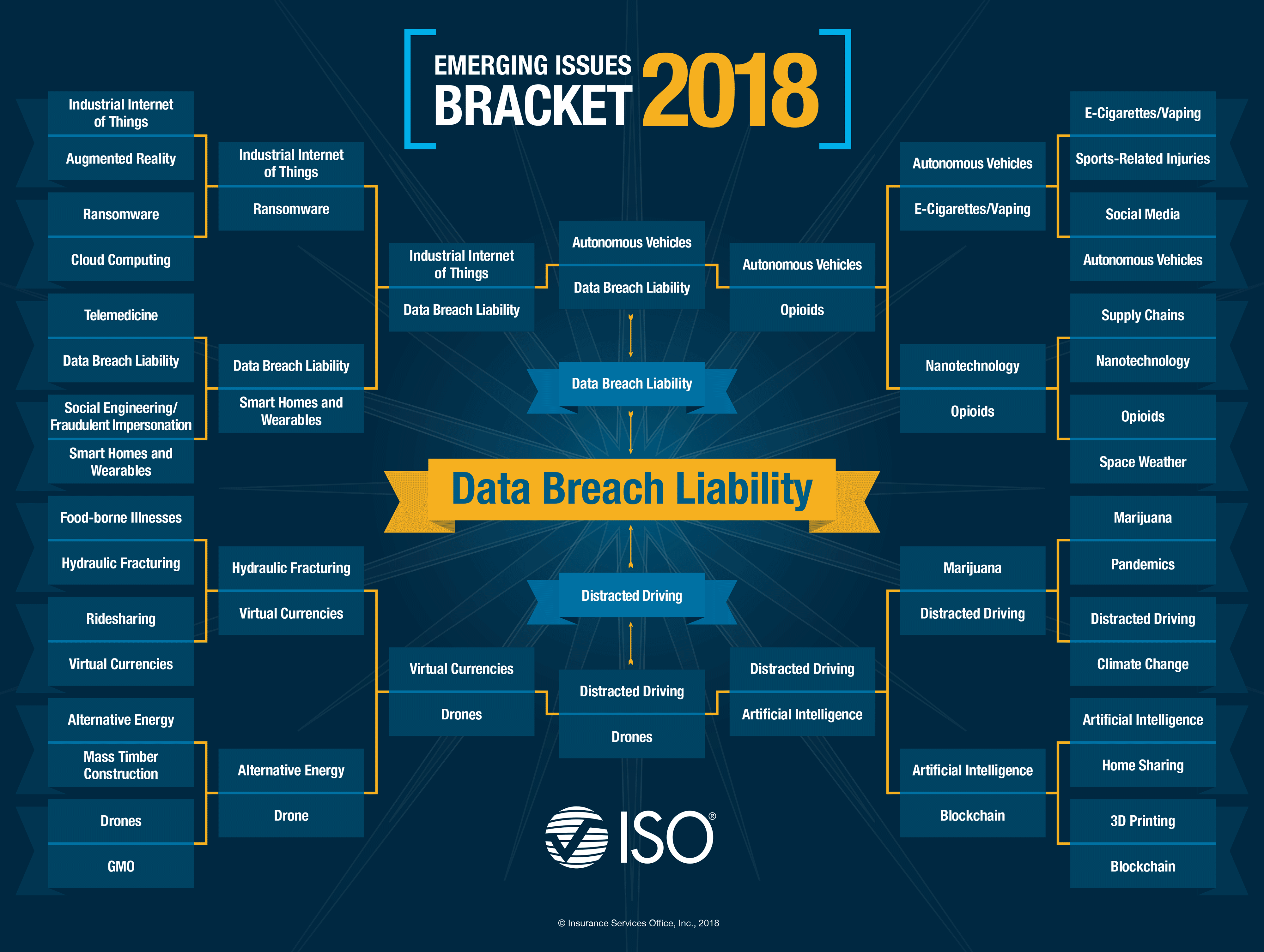 Perhaps because of recent high-profile data breaches, including the reported Equifax breach, cybersecurity-related issues are back on top in the ISO Emerging Issues bracket. This year, data breach liability edged out distracted driving in the final round to become the winner of ISO’s fifth annual Emerging Issues Bracket.