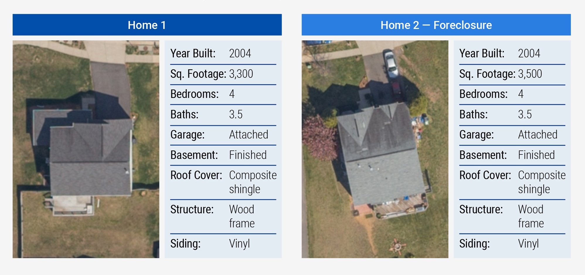 Specific homeowners data, such as foreclosure status, can affect a property's risk profile. Between two properties that look nearly identical, there's a worrisome indicator: a severely stained and deteriorating roof. Knowledge like this enables a more efficient use of resources, calling for an inspection only when necessary.